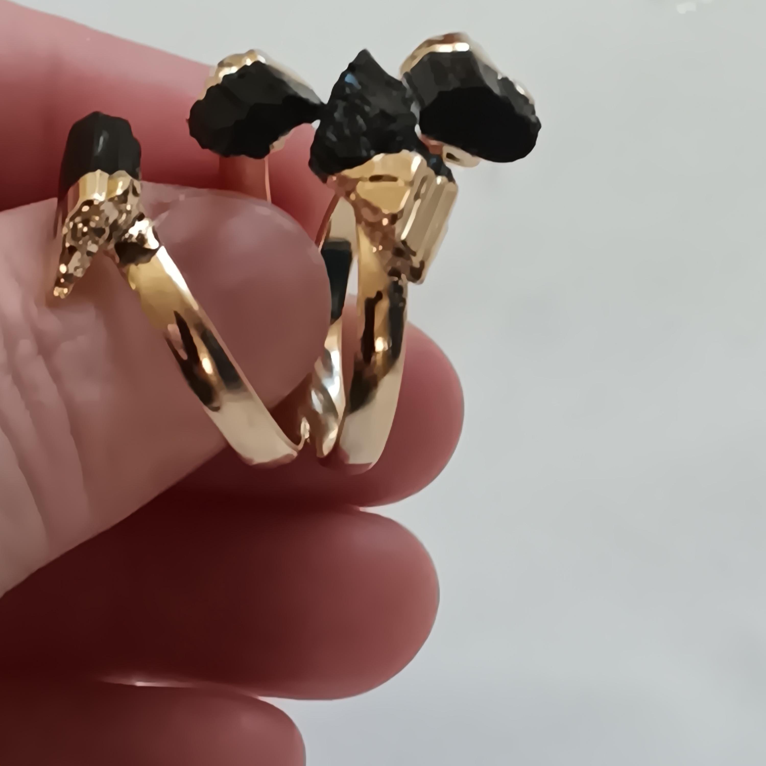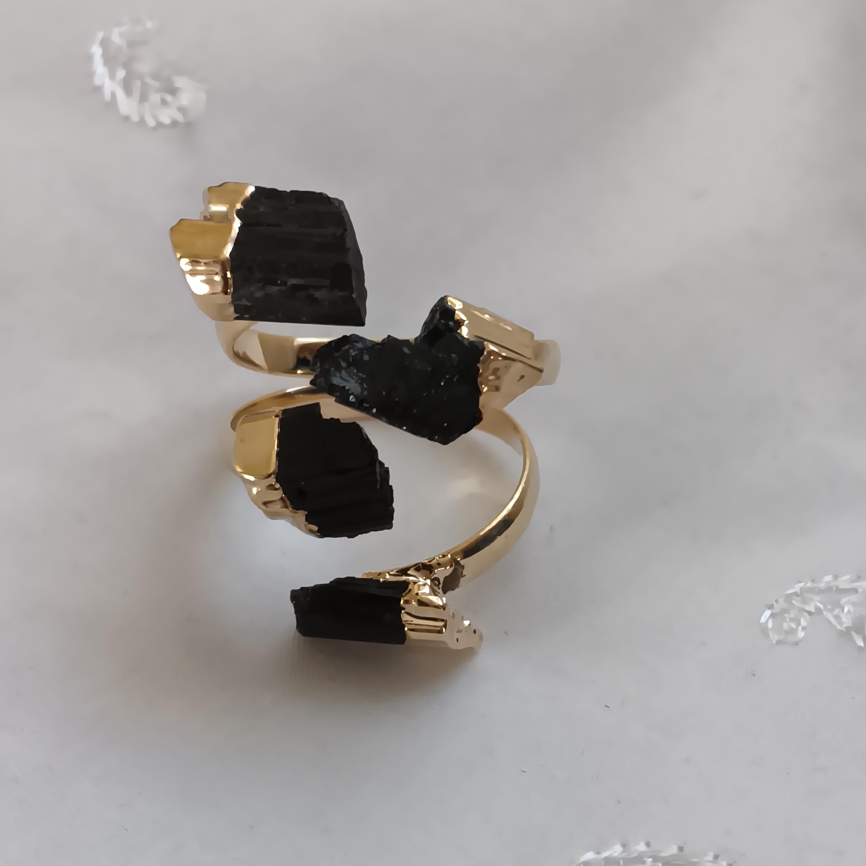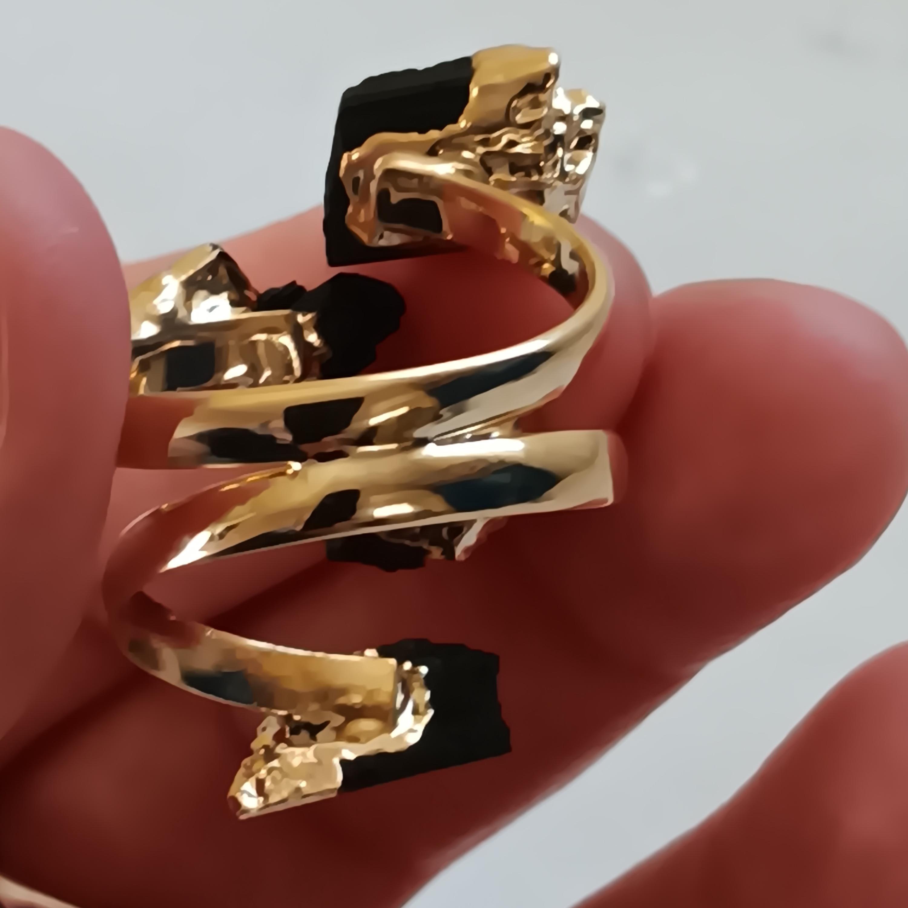 Unusual, funky, genuine black tourmaline adjustable ladies ring set in goldtone. It is more of a cocktail ring, and features 4 black tourmaline schorls, and is quite the statement piece. Black tourmaline is a powerful protective stone known for grounding, clearing negative energy, and shielding against electromagnetic fields (EMF). Associated with the root chakra, it promotes emotional stability, confidence, and calmness by alleviating stress, anxiety, and fear. It is often used to promote physical detoxification and enhance mental clarity. It's a fun and eyecatching ring; brand new, never worn. $25 price firm. Thanks.