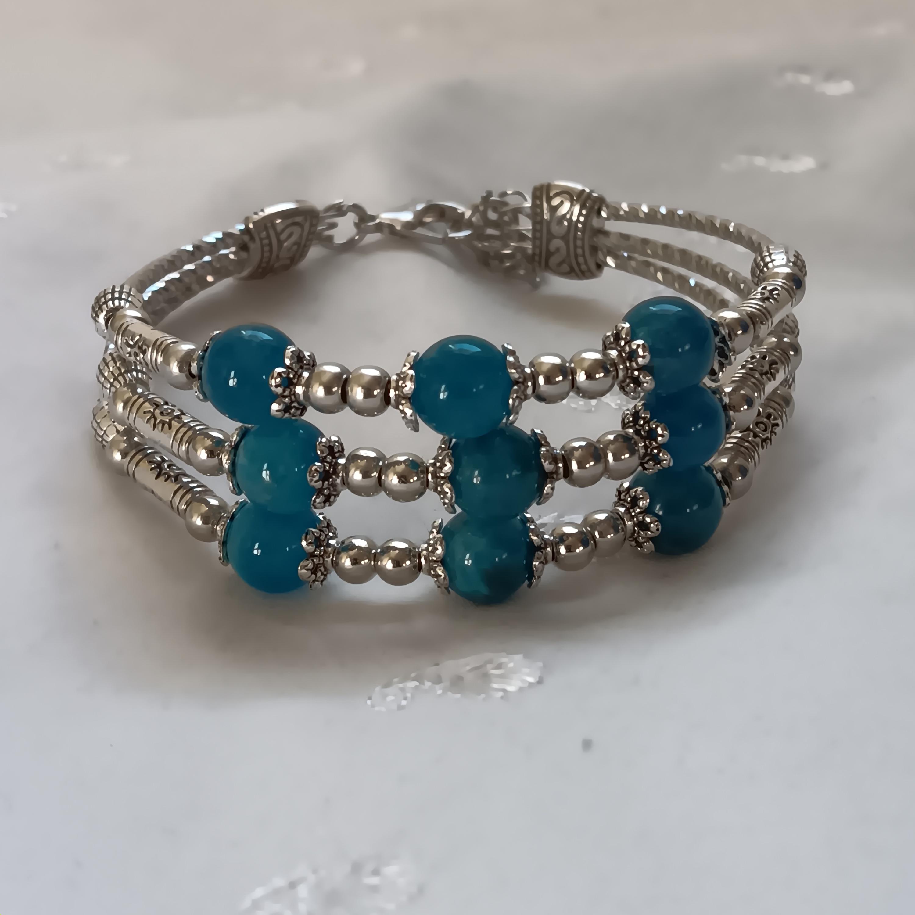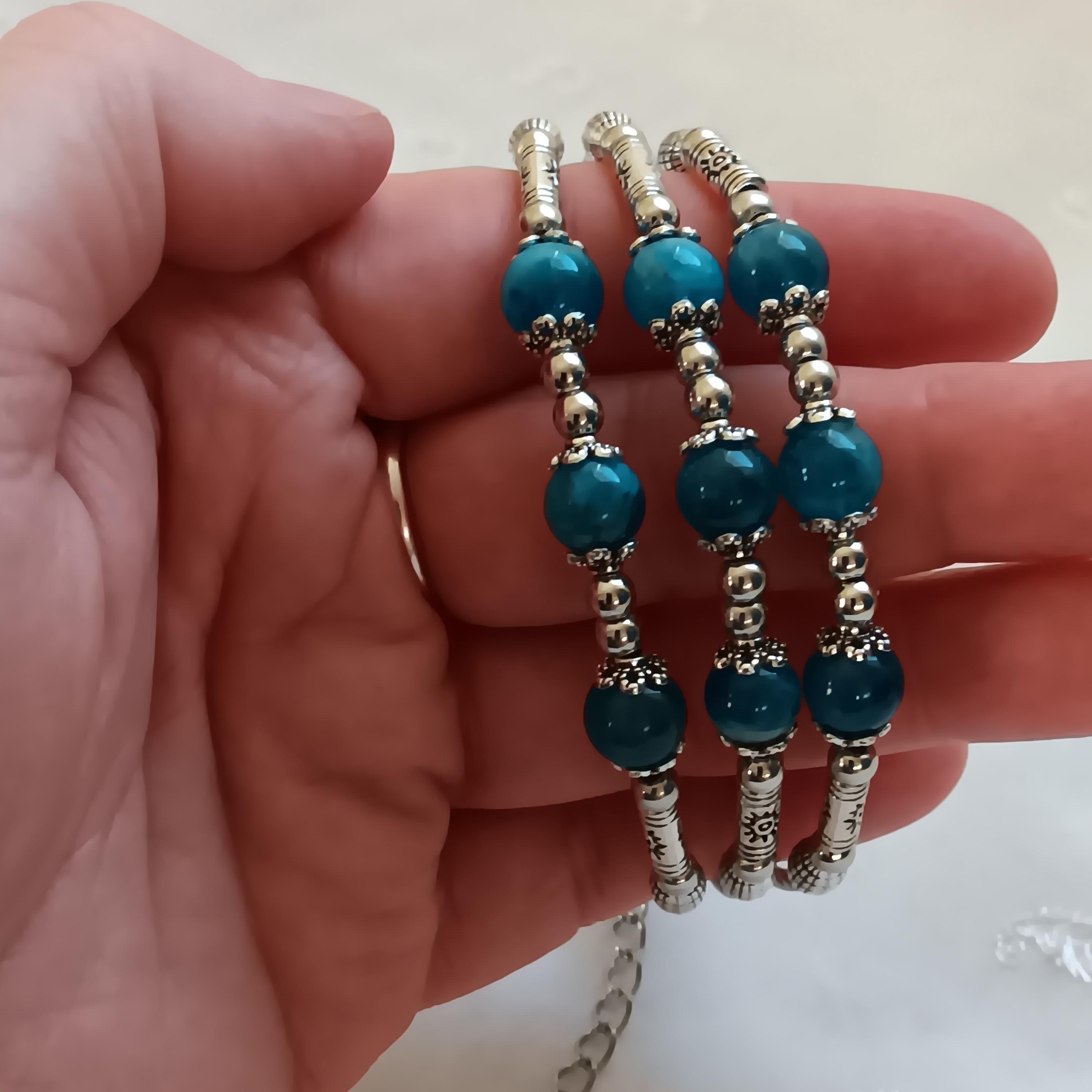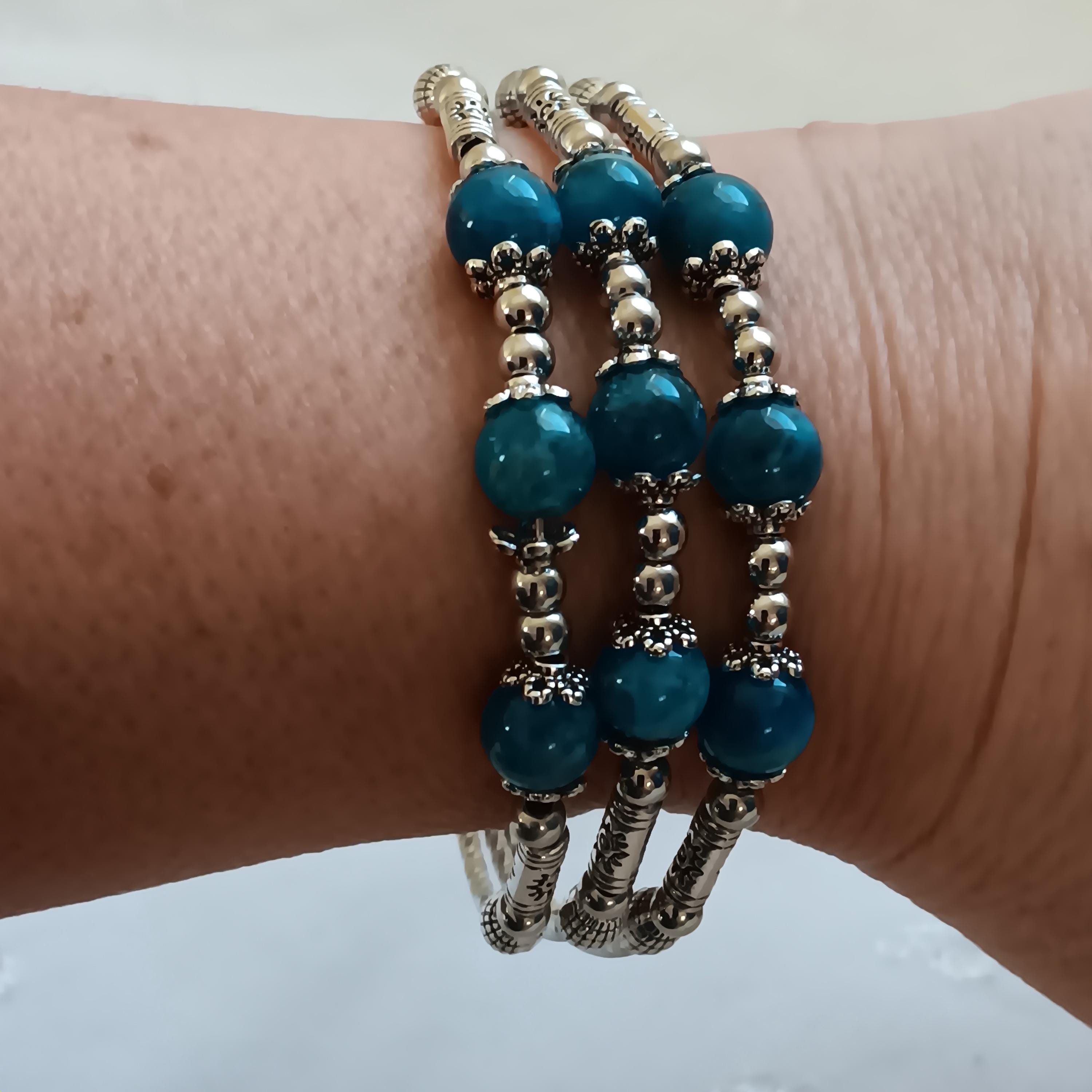 Lovely, genuine apatite and silvertone, Triple-Strand ladies bracelet. Apatite helps to clear and strengthen the throat chakra, which helps to heal the heart and open the mind to spiritual guidance. This process makes us stronger communicators, both in our personal lives and in business. It features 3 rows of silvertone beads with three apatite beads on each strand. Has a lobster-claw clasp, is adjustable and is about 2" wide. It is brand new, never worn. $30 price firm, cash only(I will not lower the price). Thanks. 🙂