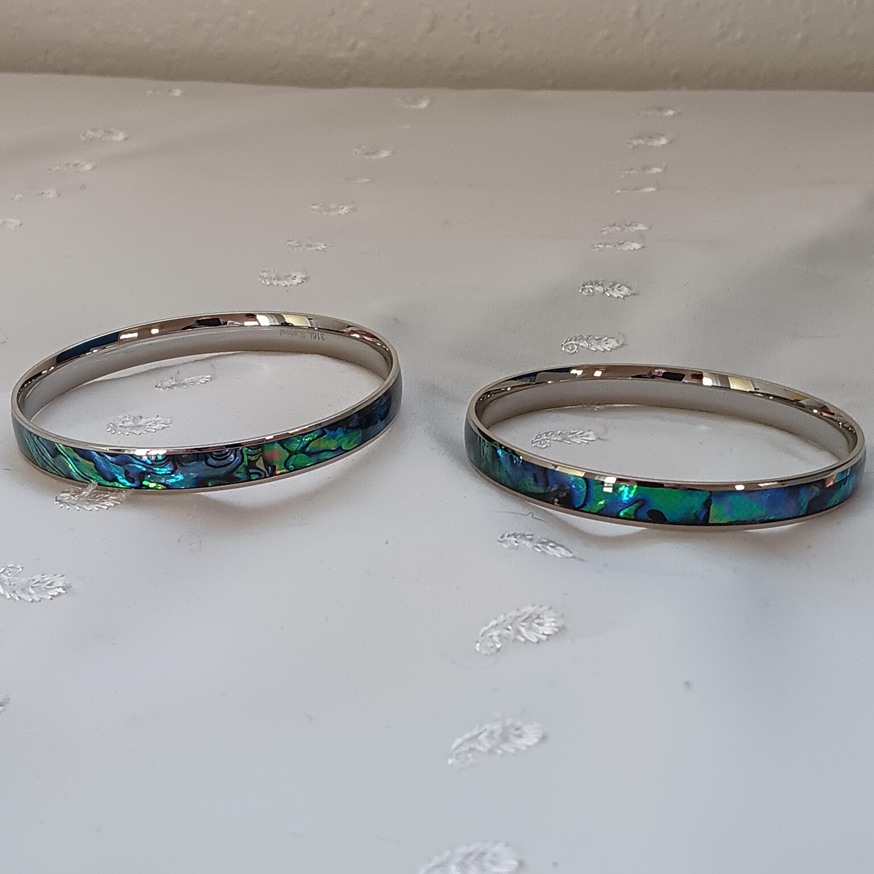 Lovely set of two, genuine abalone shell ladies bangle bracelets set in stainless steel. Abalone Shell is a crystal that's know for protection. Typically, in crystal healing protection means that the crystal shields you from negative energy. It can also mean that your emotions are being protected when you know you're entering bad situations. Beautiful, iridescent, ocean-blue abalone shell is set in stainless steel; brand new, never worn. $30 for the set, price firm(I will not lower the price). Thanks. 🙂