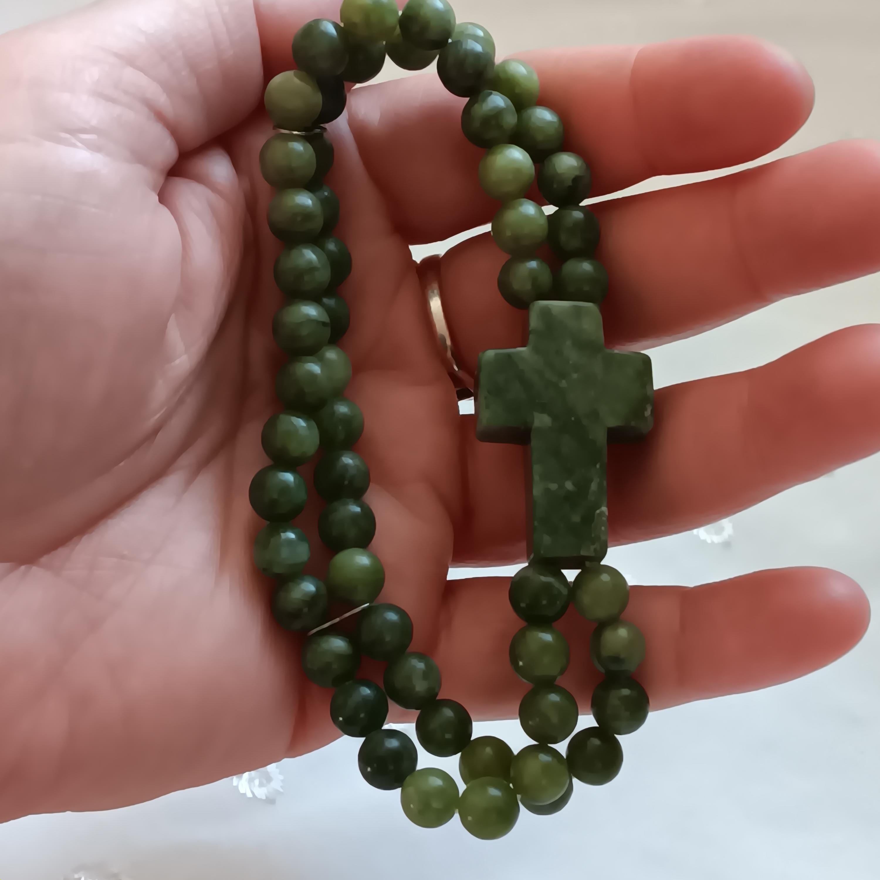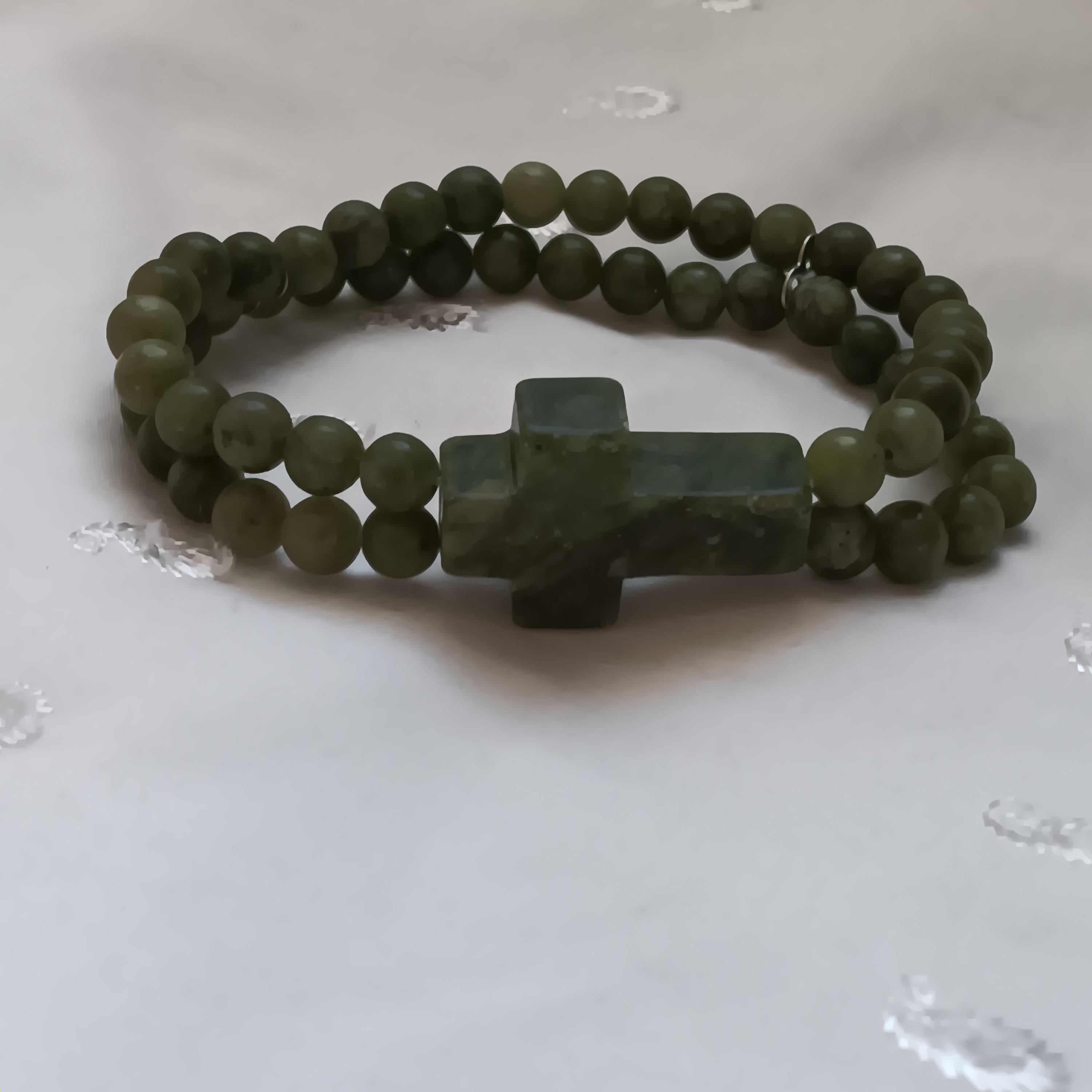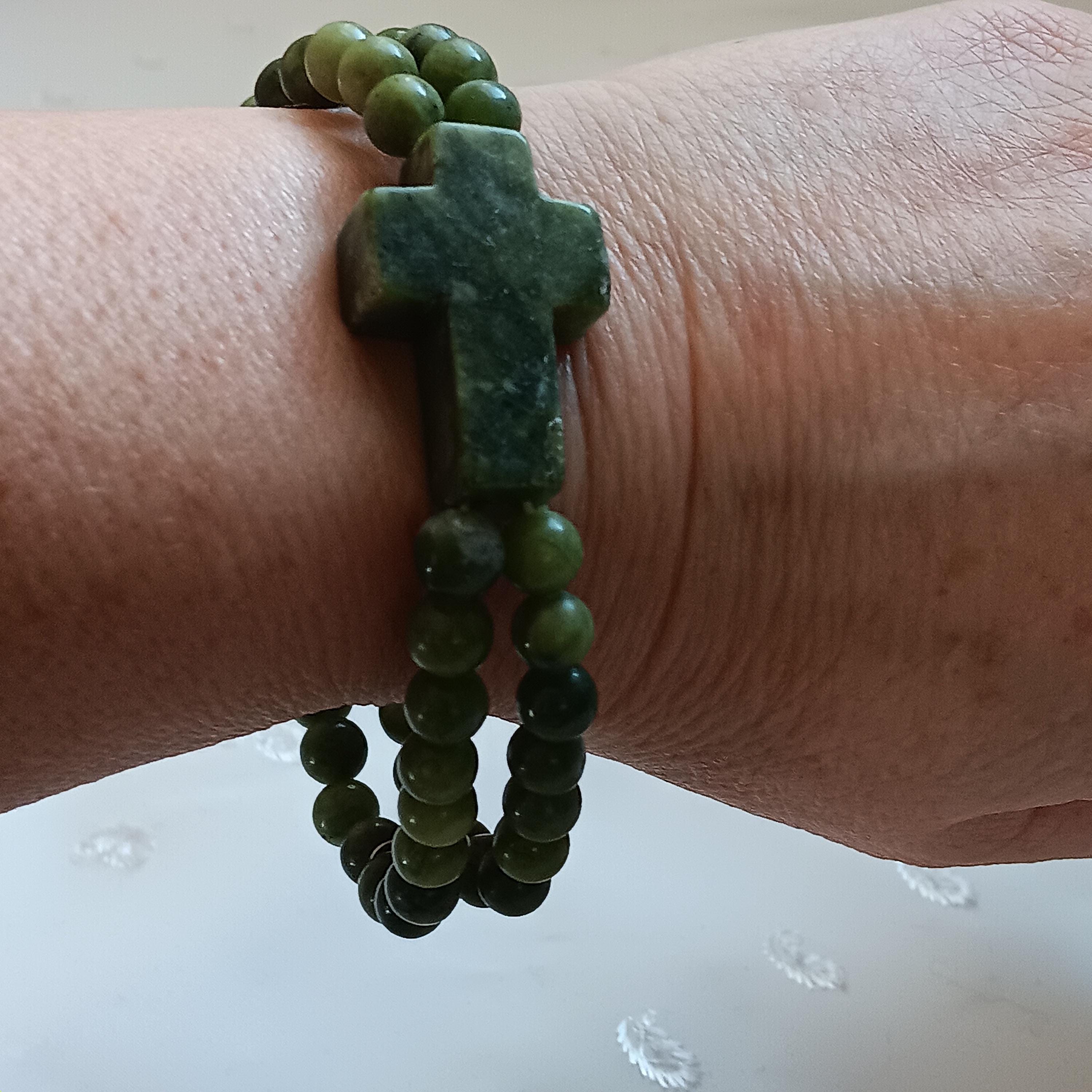 Very nice, genuine, green Irish Connemara marble beaded cross stretch bracelet. It's a lovely, earthy, cool green color, has two rows of small, round beads that attach to a cross on the front of the bracelet. Metaphysically, crystallized marble is believed to possess grounding and stabilizing properties. It is associated with promoting a sense of balance, serenity, and harmony. Crystallized marble is thought to emanate a soothing energy, calming the mind and nurturing a connection with the natural world. Is unisex, price is $25. Perfect for showing your faith, and also your Irish heritage.