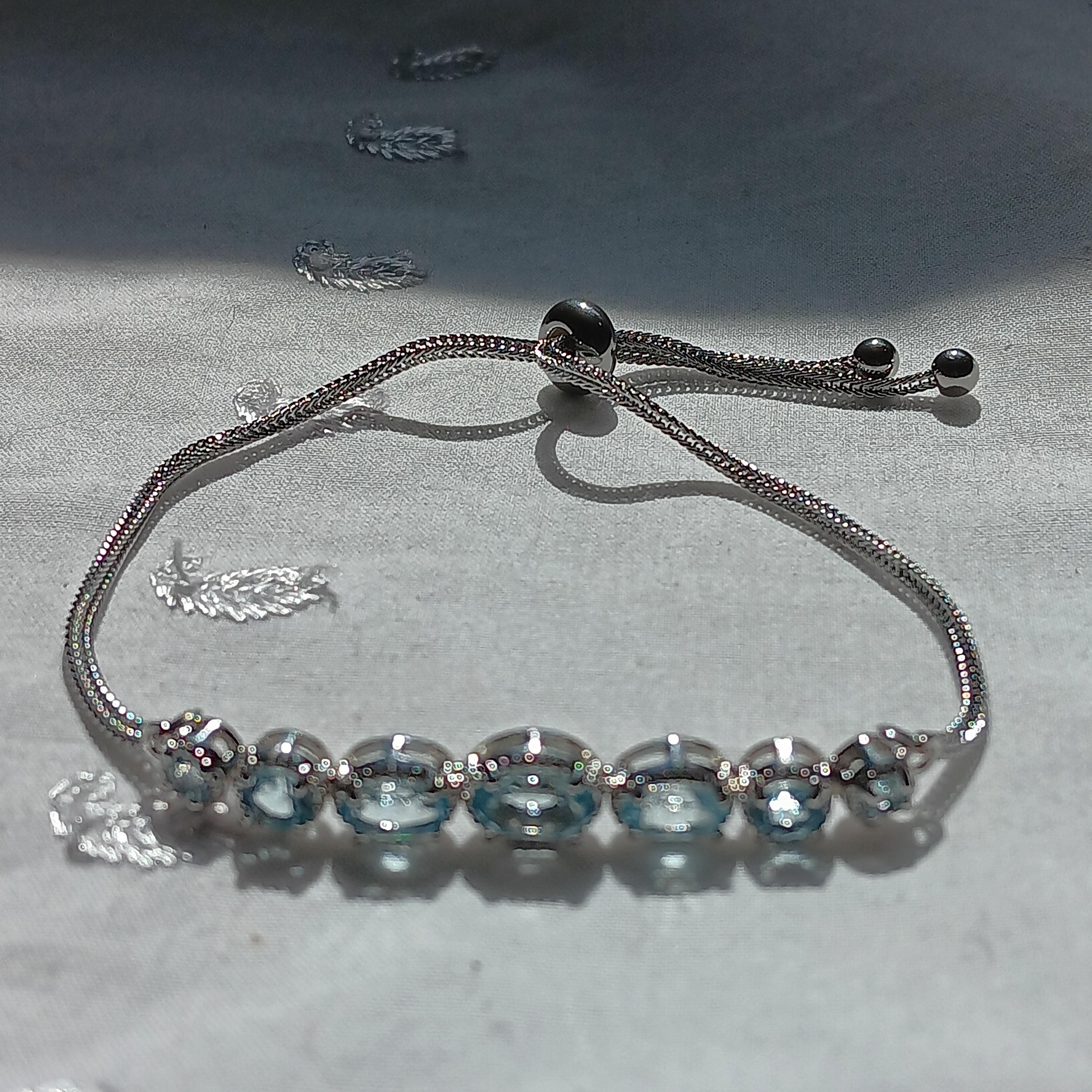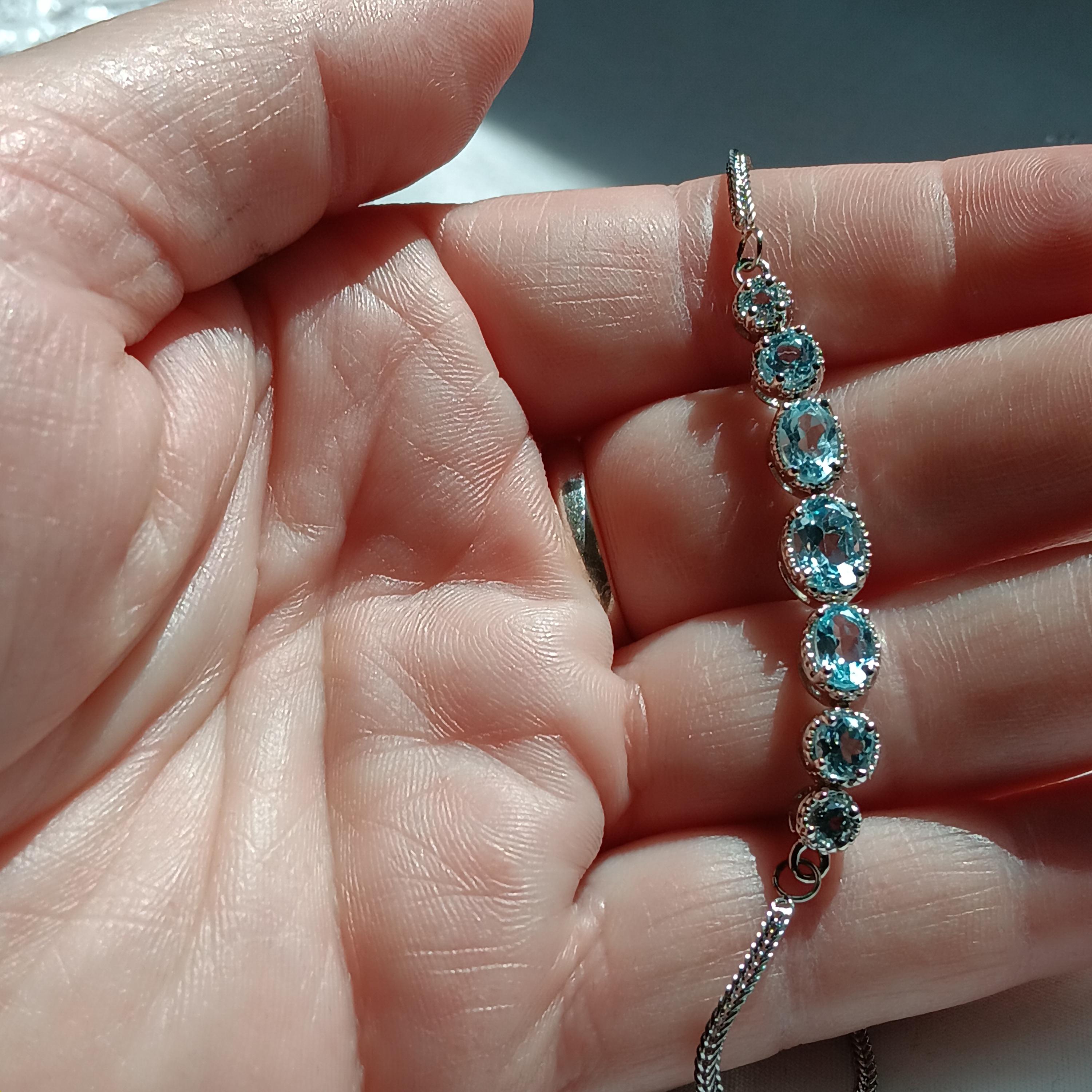 Lovely, blue topaz adjustable bracelet set in silvertone. It has a slide adjustment on it. It features 7, oval-cut, blue topaz stones in graduated sizes. One of the most celebrated blue topaz healing powers is its potential to ease emotional stress. If you've ever felt overwhelmed by stress or tangled up in your emotions, blue topaz is believed to help calm the storm. During times of emotional turbulence, this stone is thought to bring clarity and peace of mind. $40 for the bracelet, price firm. Thanks.