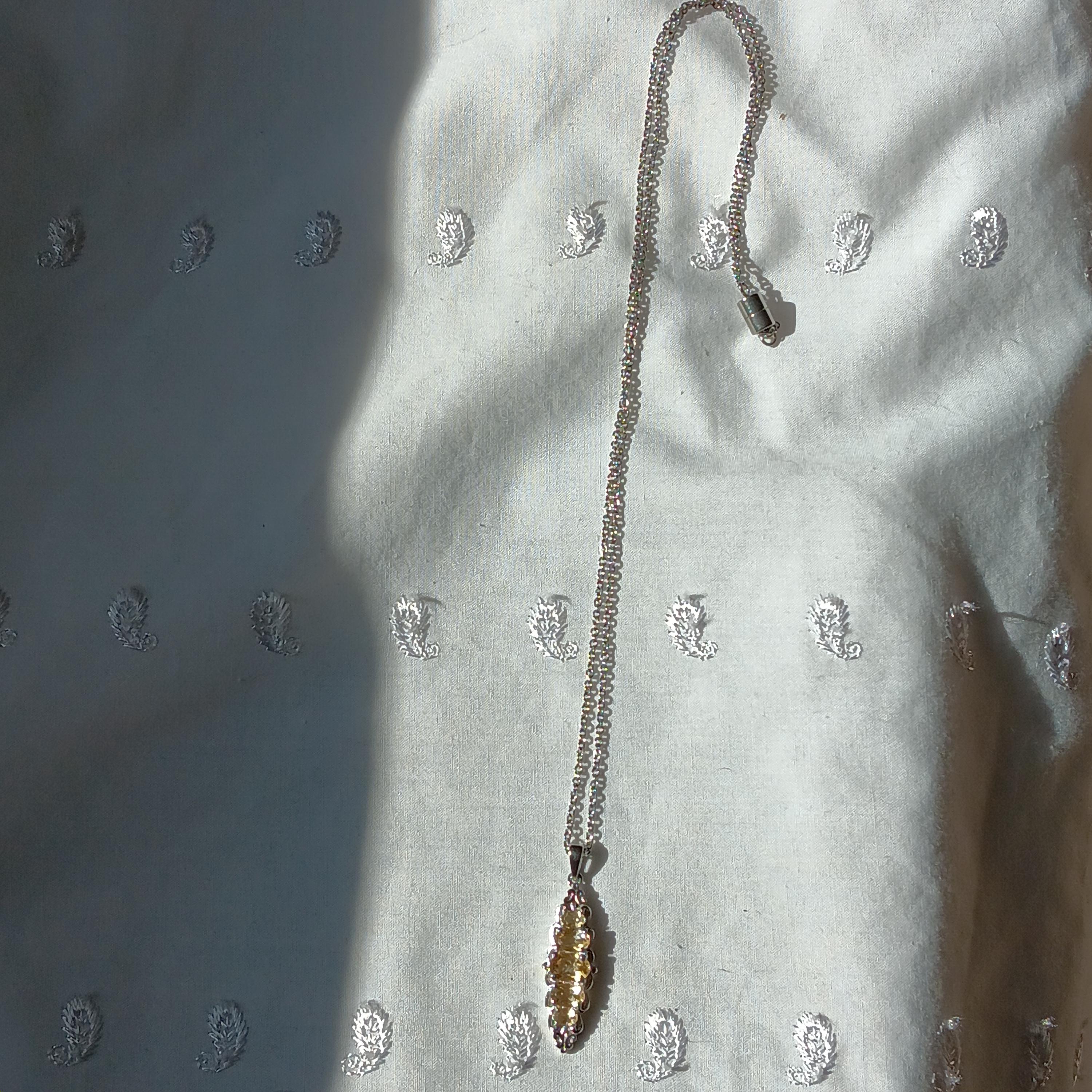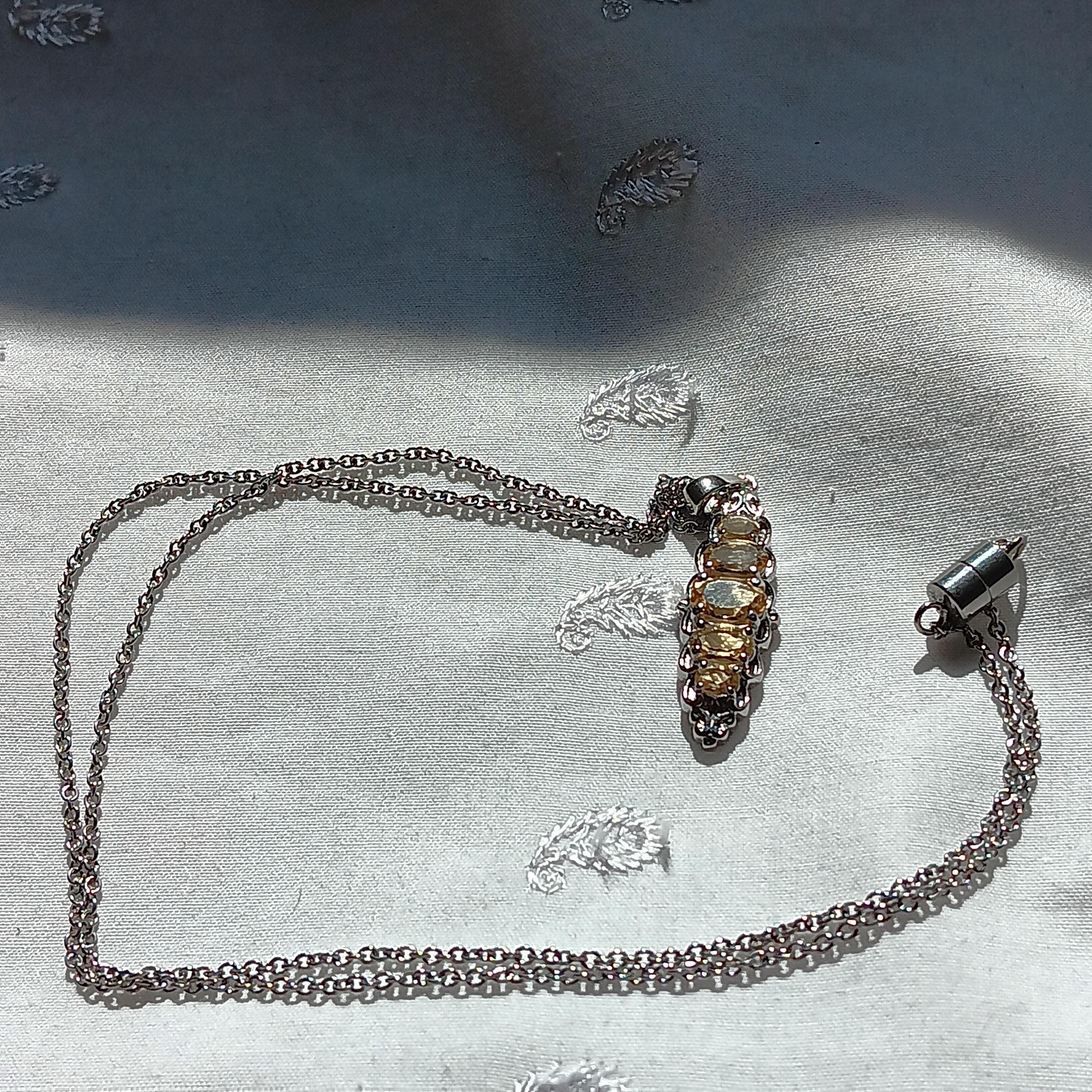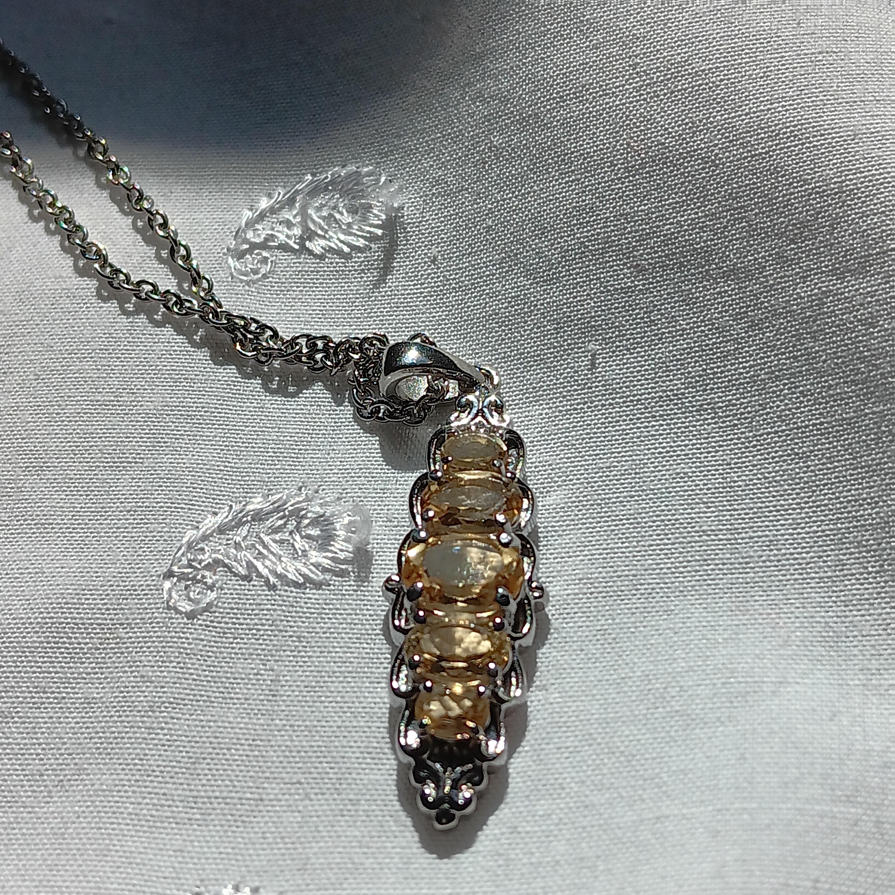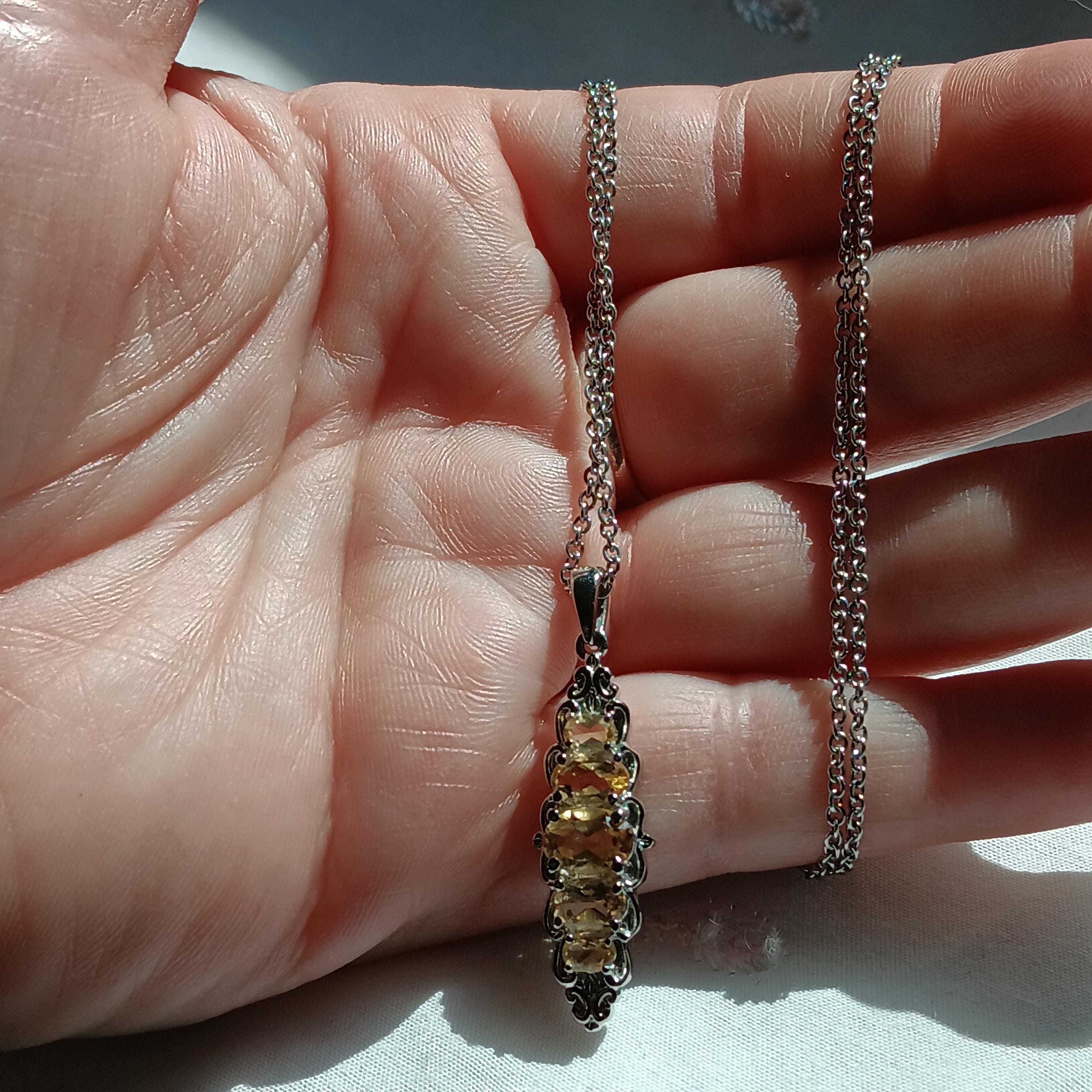 Lovely, genuine citrine and silvertone necklace. It features an antique-style, silvertone pendant with 5, oval-cut, citrine in different sizes, on a silvertone chain. Necklace is about 11.25" in length with a screw clasp. Citrine is a vibrant yellow quartz variety, often called the "Merchant's Stone" or "Stone of Joy," believed to carry the sun's power to boost energy, creativity, and confidence. It is used to attract abundance, promote emotional balance, and cleanse negative energy. $20 price firm. Thanks. 🙂