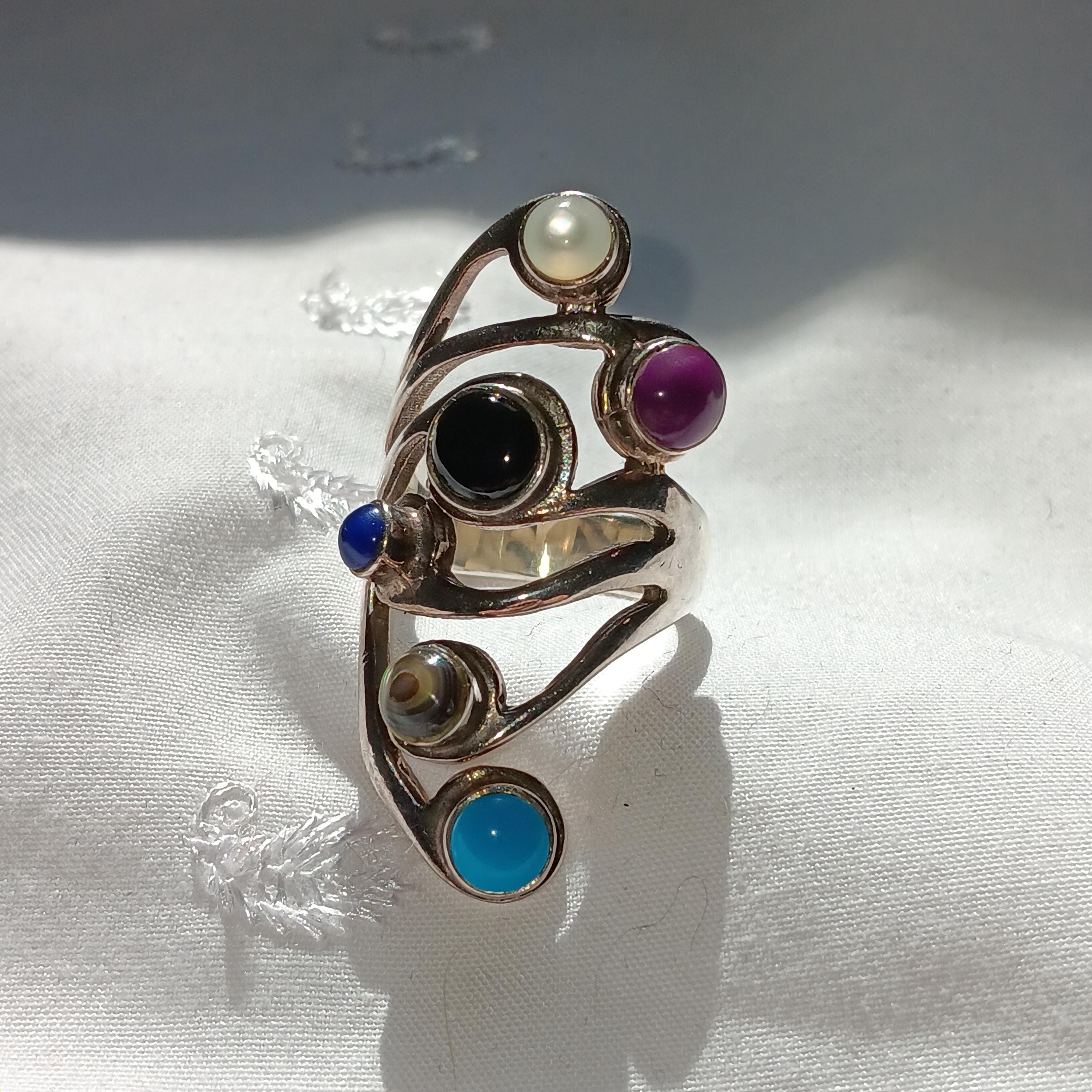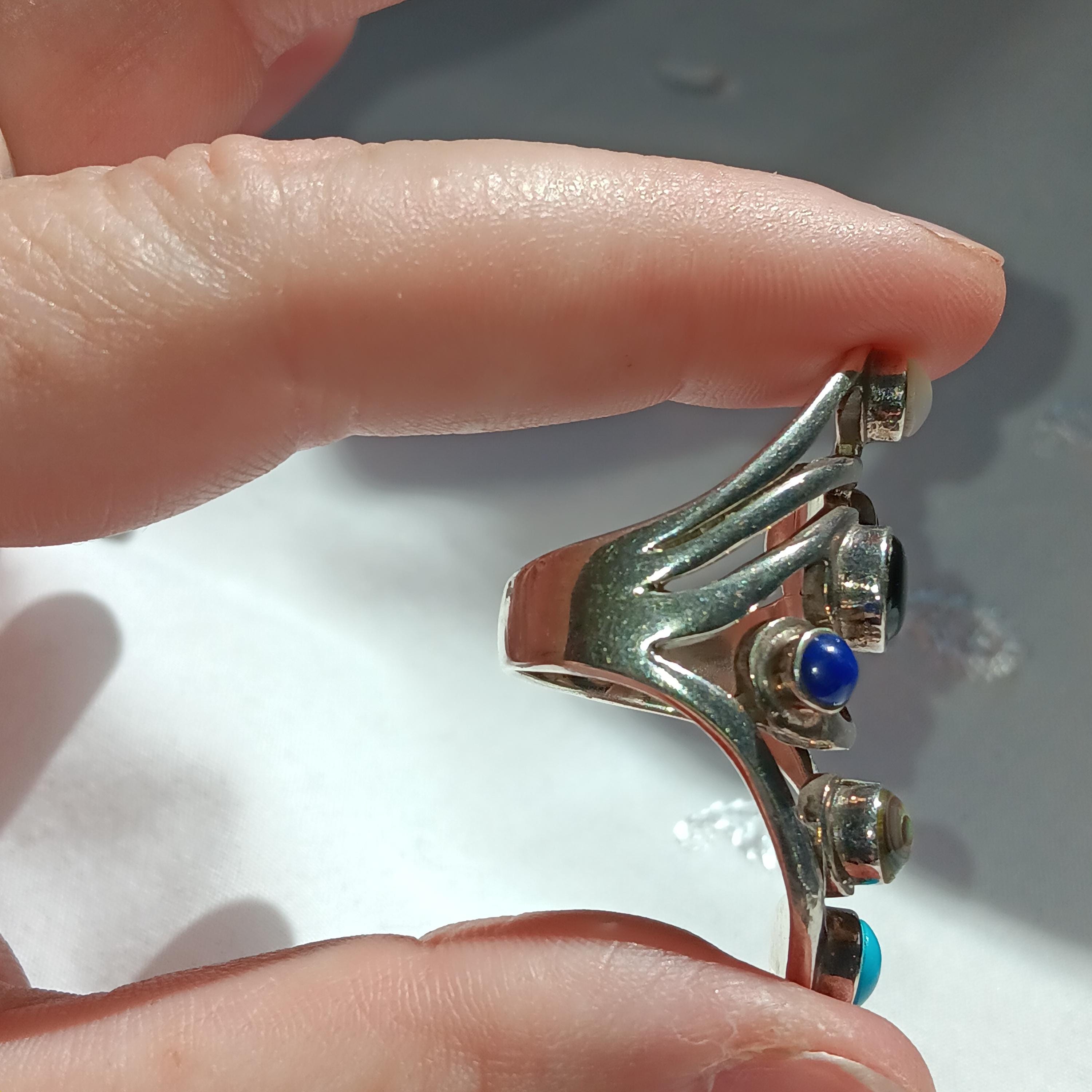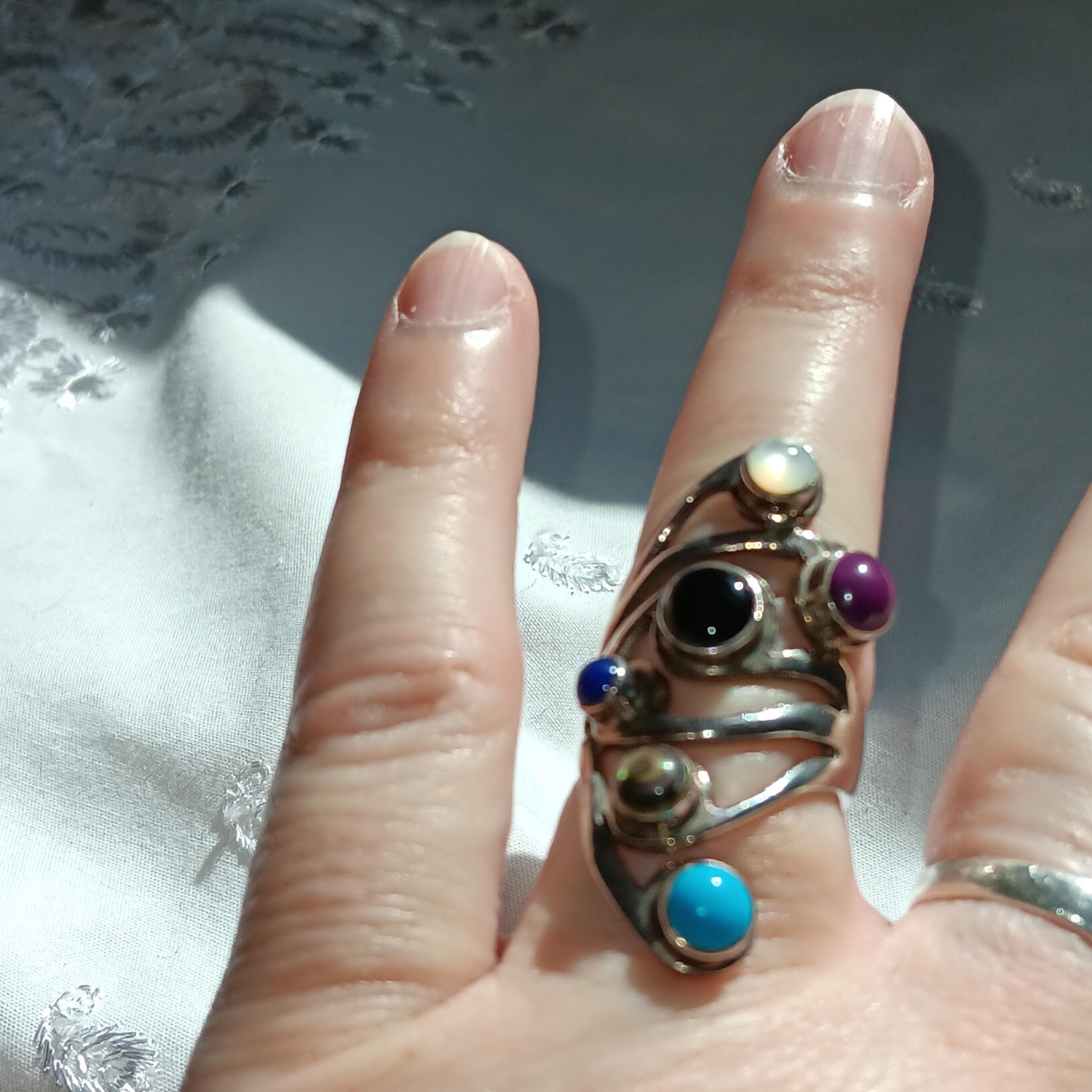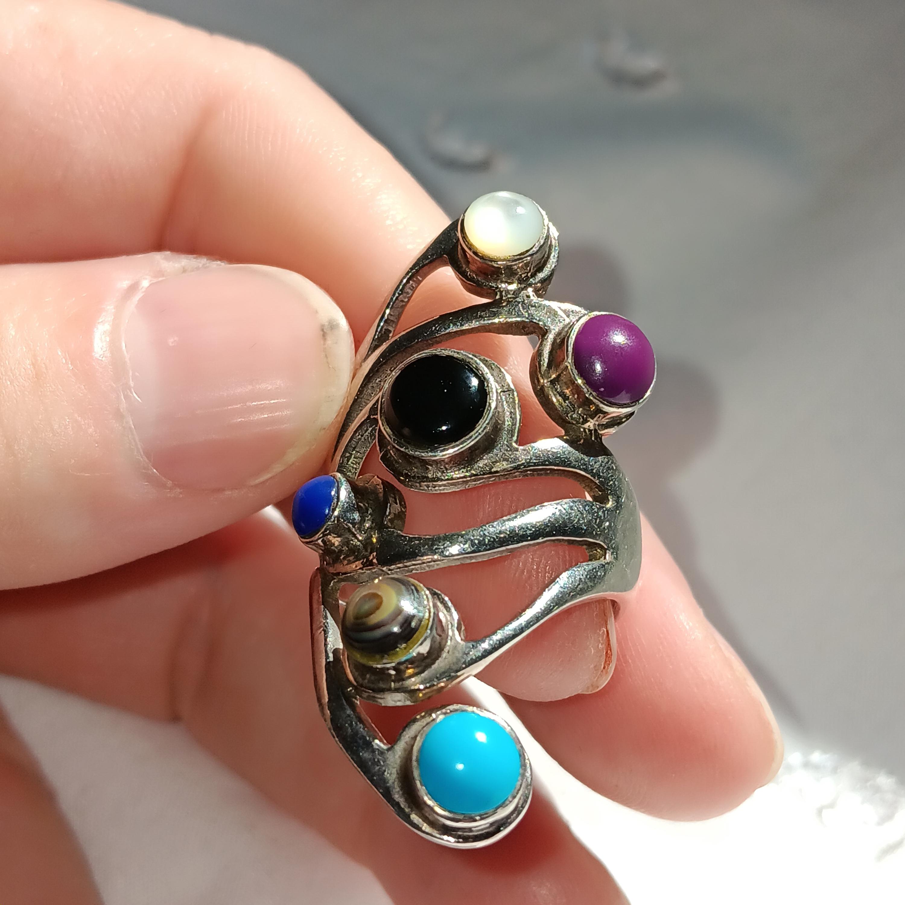 Unusual, sterling silver and multi-gemstone statement ring. It is a size 6, in great shape, and features genuine gemstones of mother-of-pearl, sugilite, onyx, Lapis Lazuli, abalone shell, and turquoise. $30 for the ring, price firm. Thanks 🙂
