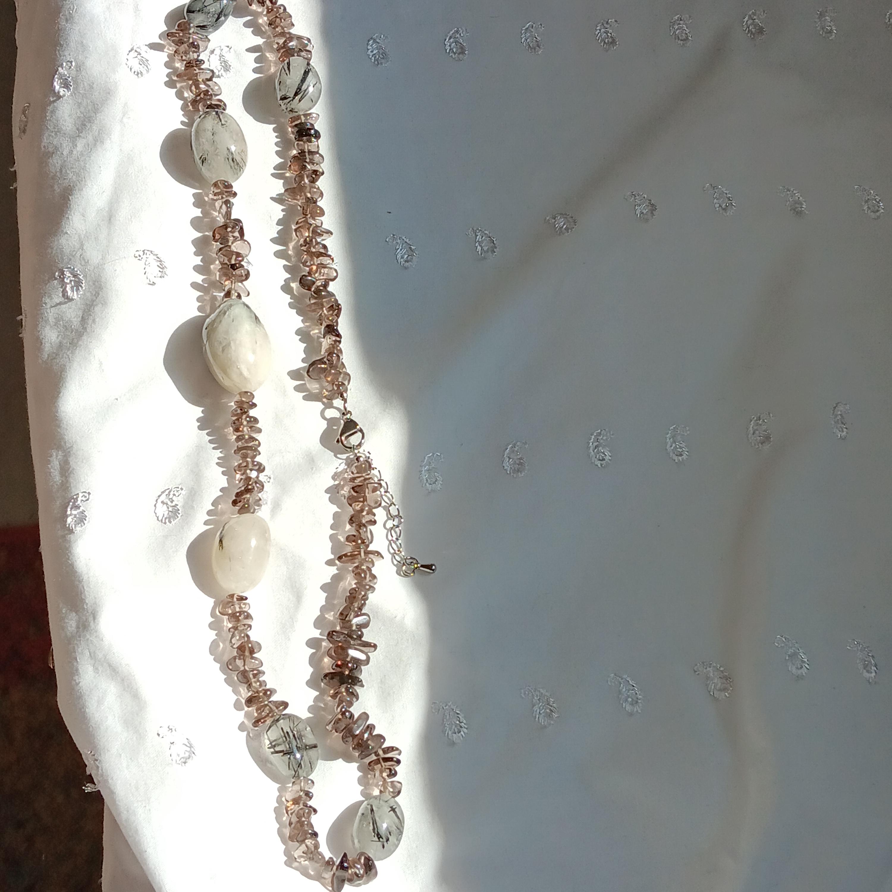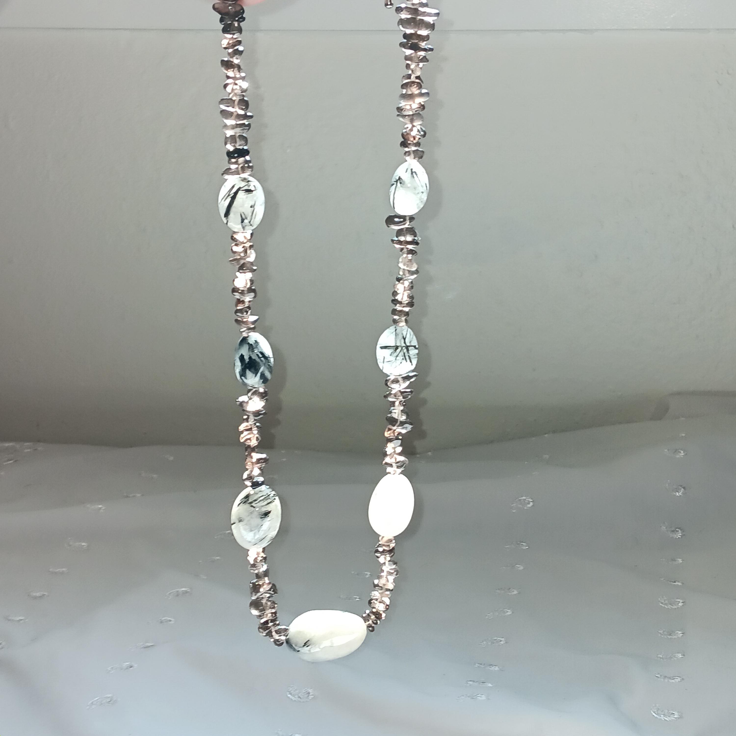 Lovely, genuine Smoky quartz and rutilated quartz beaded necklace. It features genuine Smoky quartz chips interspersed with oval-shaped, rutilated quartz beads of different sizes. It has a silver clasp and links so you can adjust the size. Necklace measures about 16.5" when clasp is closed on it. Smoky quartz is a premier grounding stone known for anchoring scattered energy, transmuting negative vibrations into positive ones, and providing deep emotional protection. Rutilated quartz is a powerful "illuminator for the soul" and energy amplifier, believed to promote spiritual growth, mental clarity, and protection. Known for its needle-like inclusions, it helps clear negative energy, ease anxiety, and facilitate emotional release. It is commonly used for boosting manifestation, focus, and willpower. $25 for the necklace, price firm. Thanks. 🙂