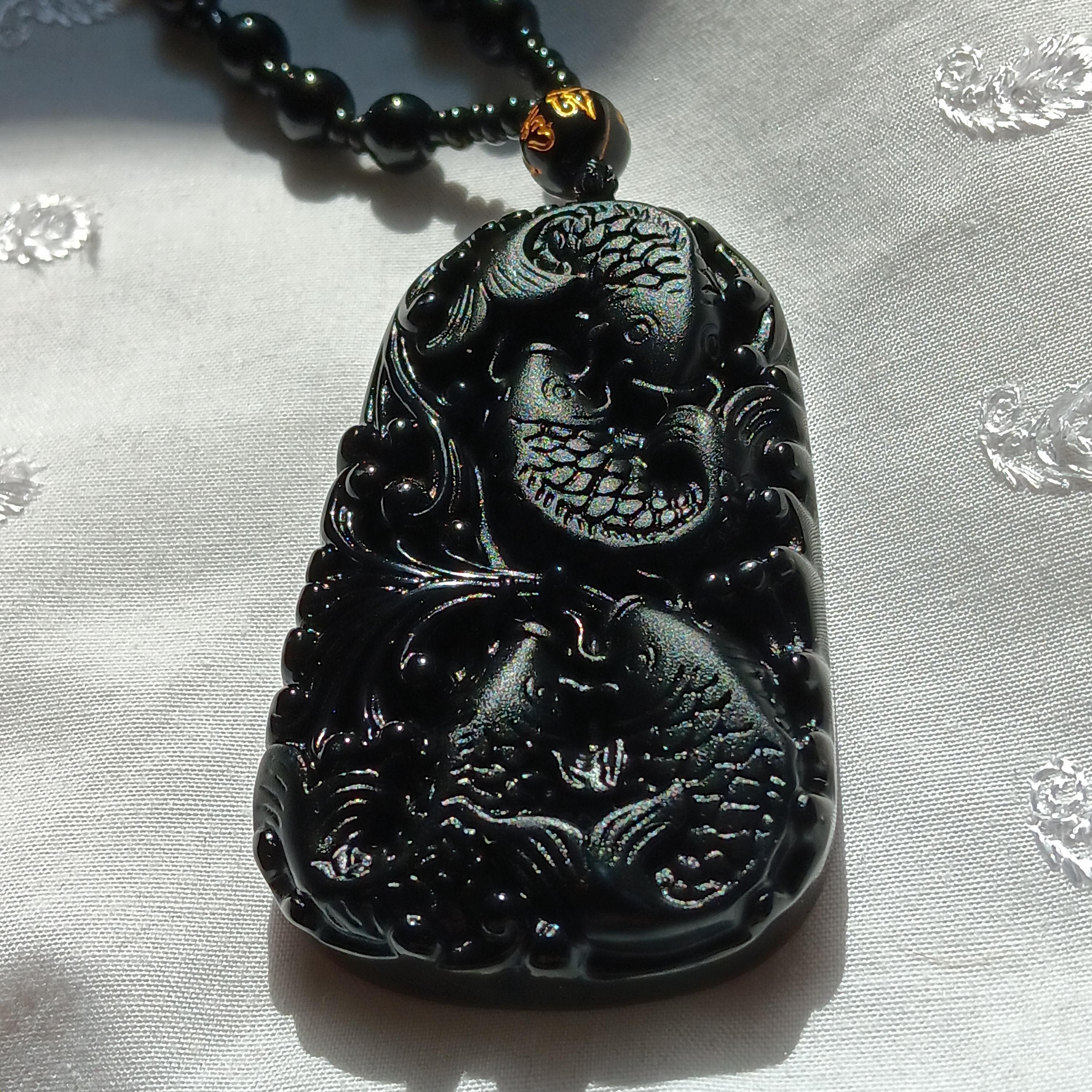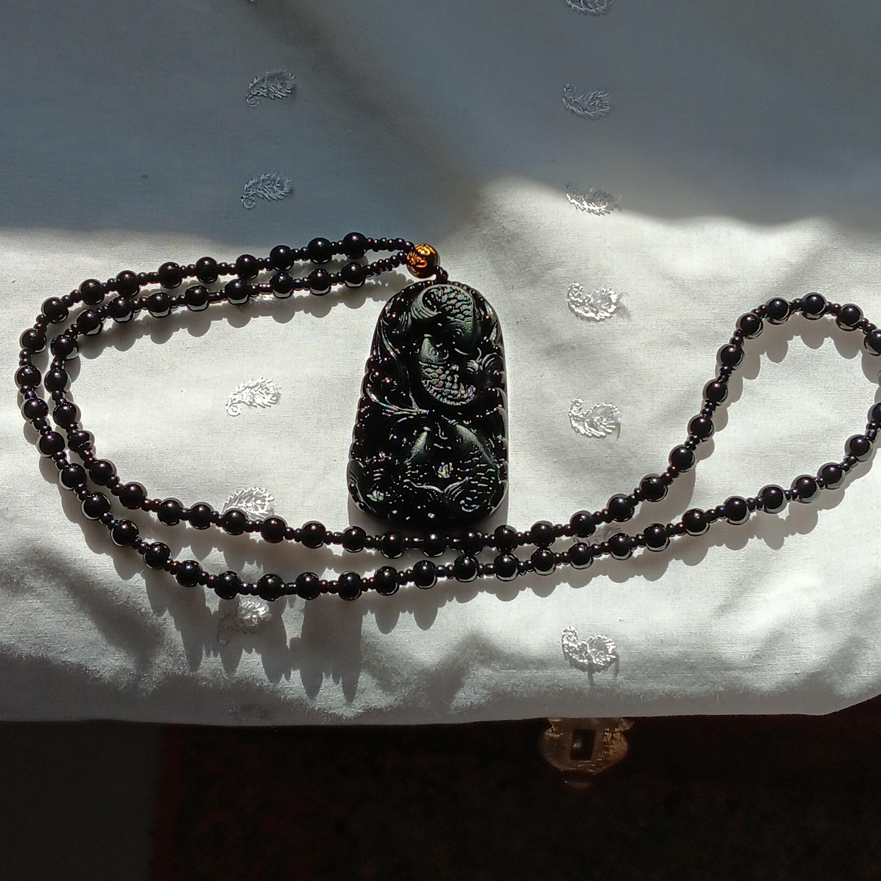 Genuine Black Obsidian Beaded Necklace W/Asian-Inspired Koi Fish