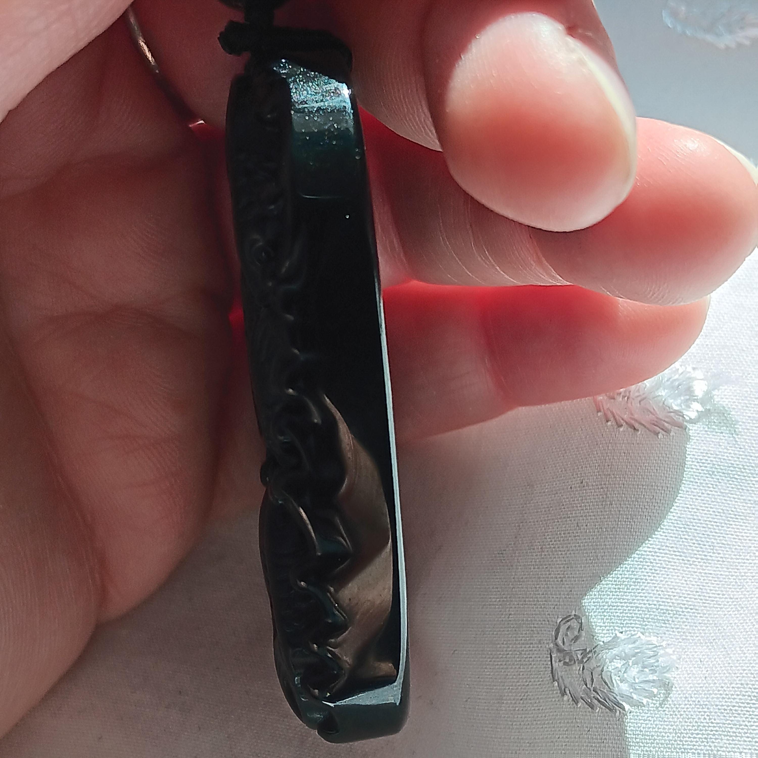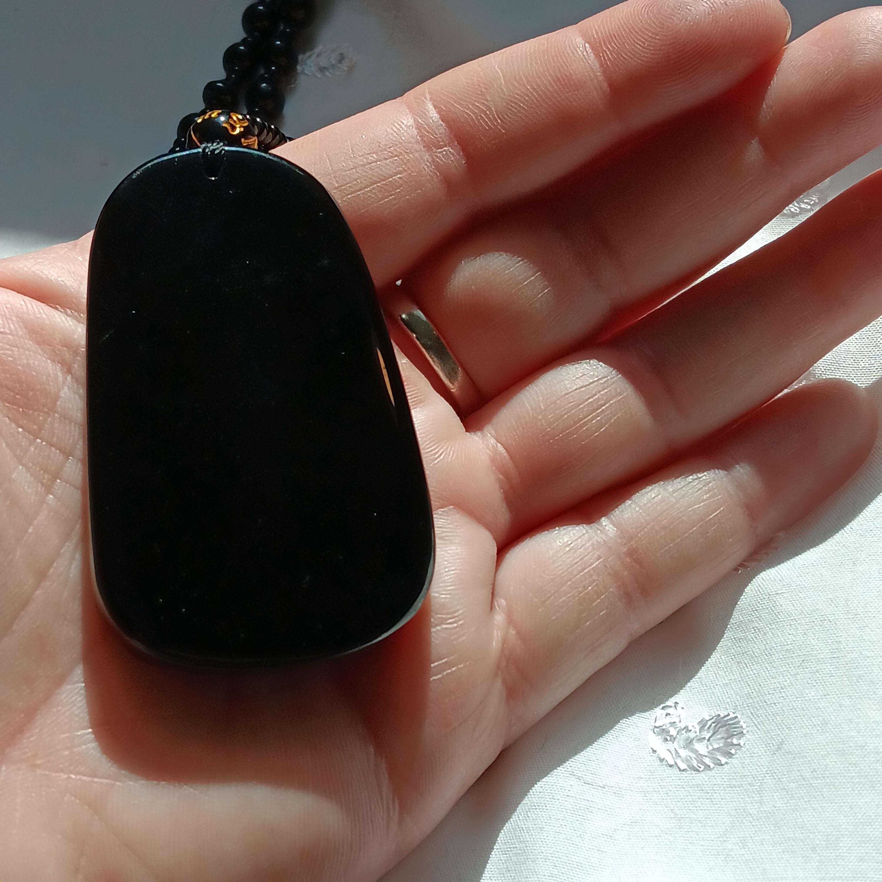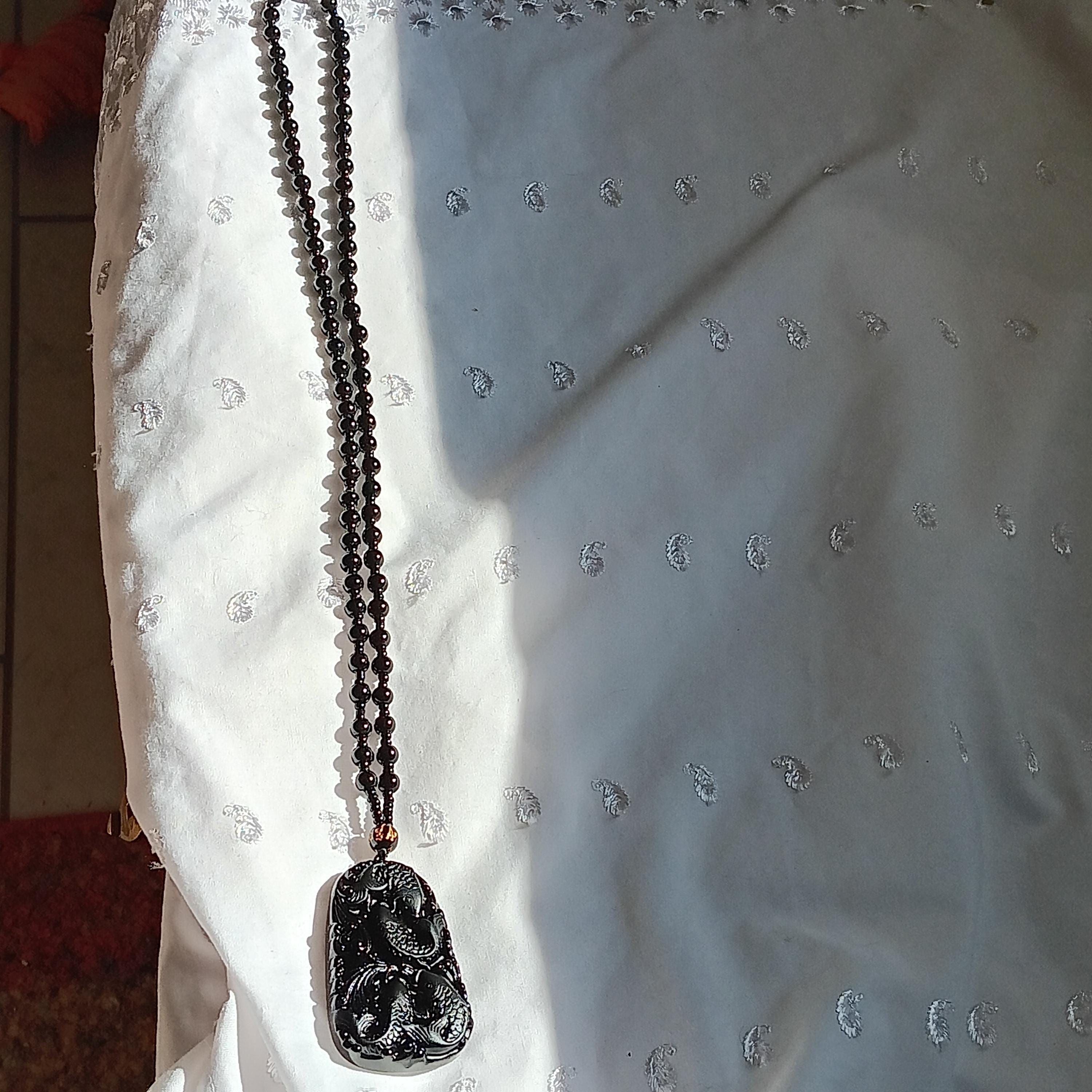 Amazing, genuine black obsidian beaded necklace with Asian-inspired koi fish necklace. The necklace features two sizes of obsidian beads with a larger, gold-etched bead above the pendant. The pendant feature four koi fish in a lovely setting carved on the front. Necklace measures from end to end 16.5", the pendant itself measure 2.25" in length and over .25" in width. $35 price firm. Thanks. 🙂
